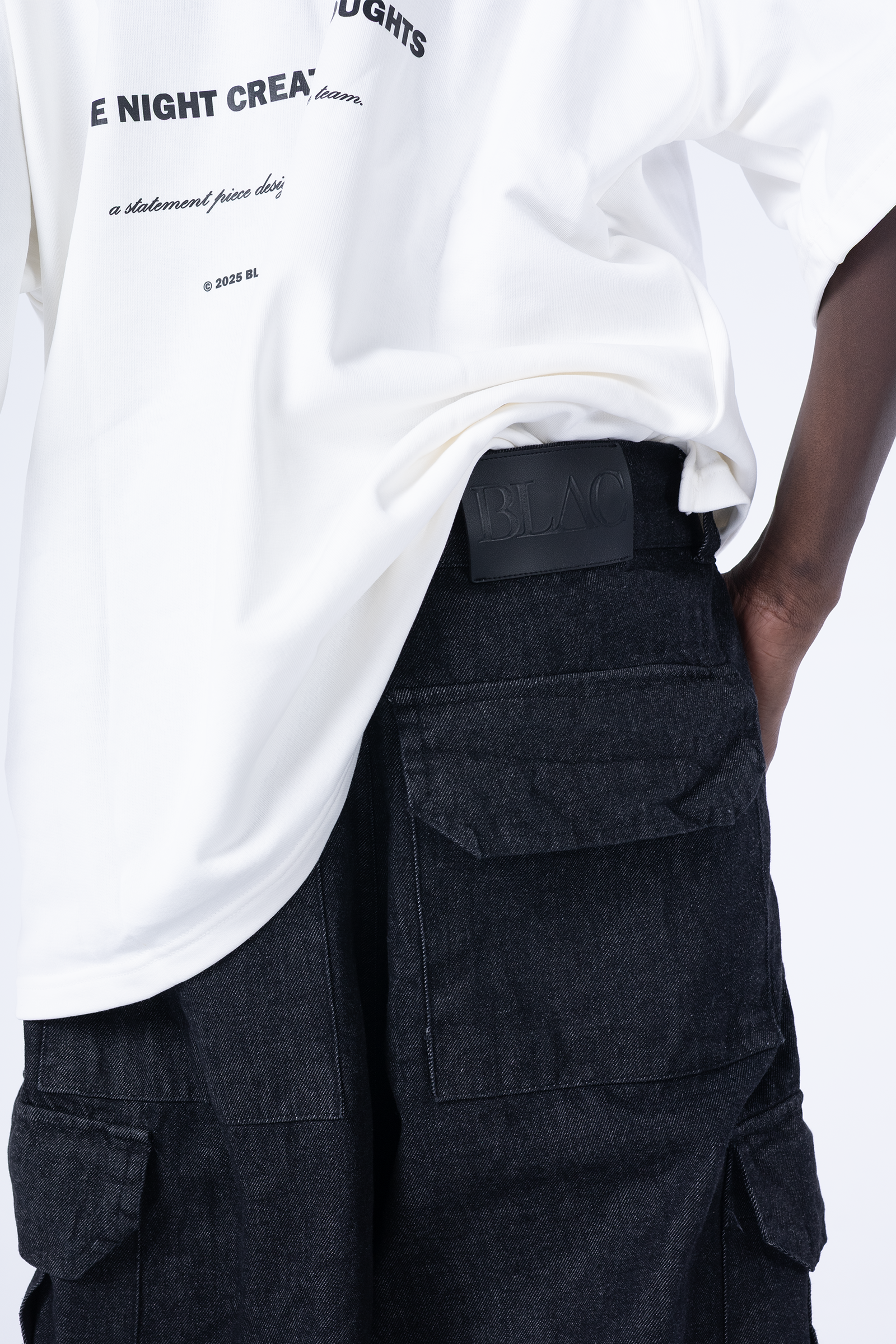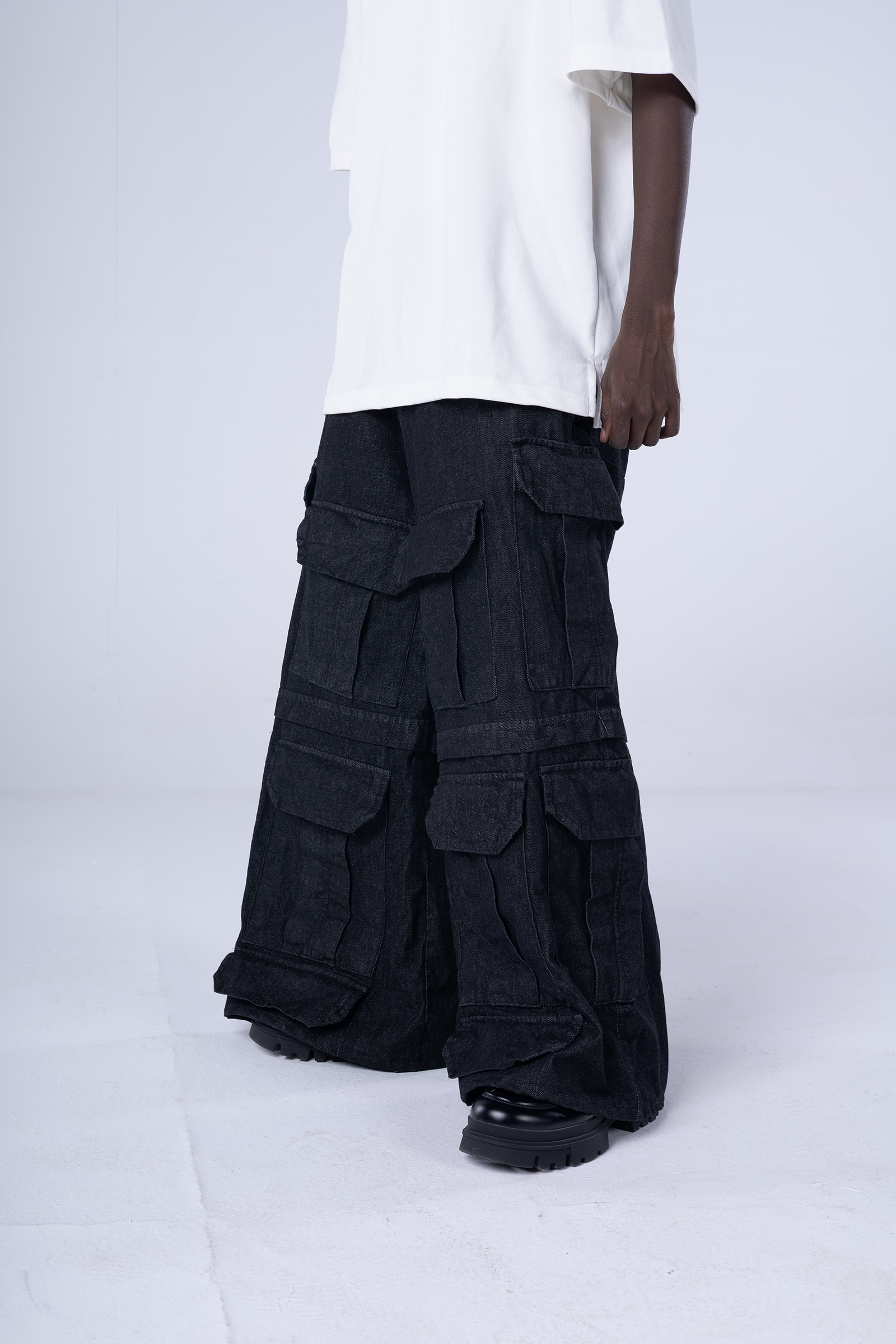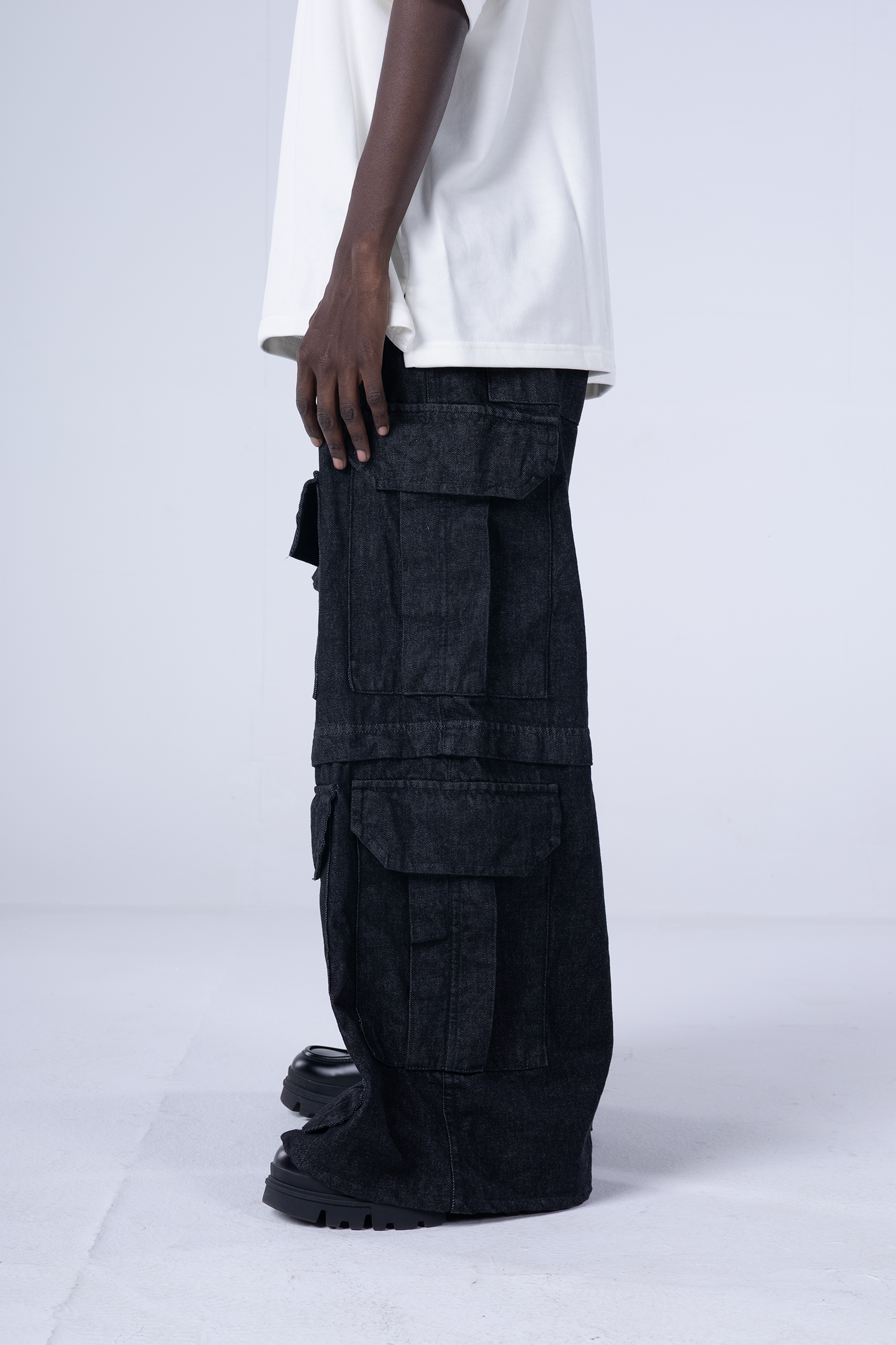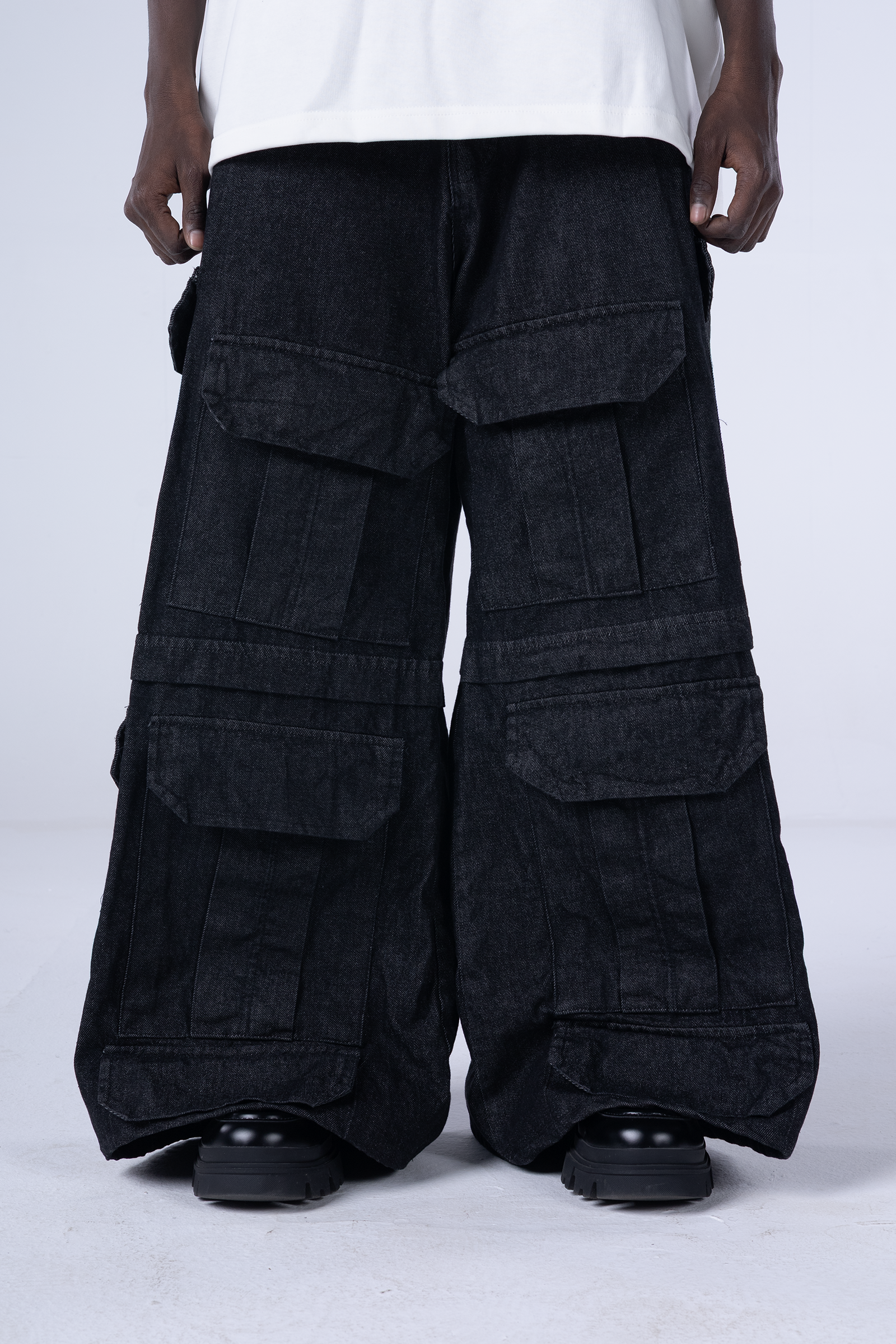 Washed Multi-Pocket Wide Leg Cargo Jeans - Black
